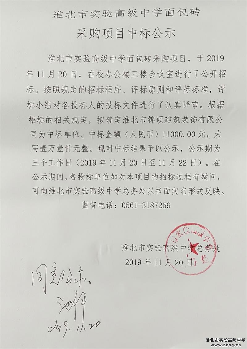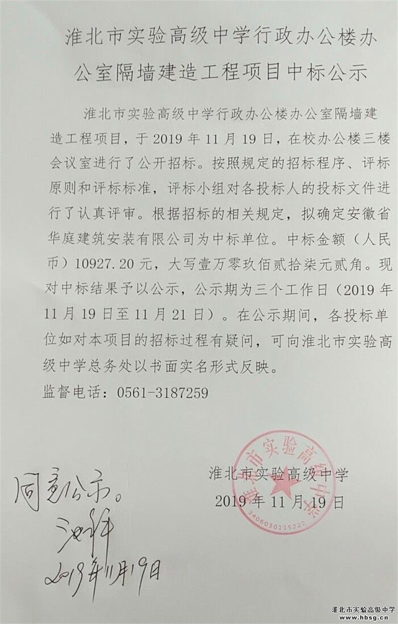 淮北市实验高级中学面包砖采购、办公室隔墙建造隔墙项目中标公示