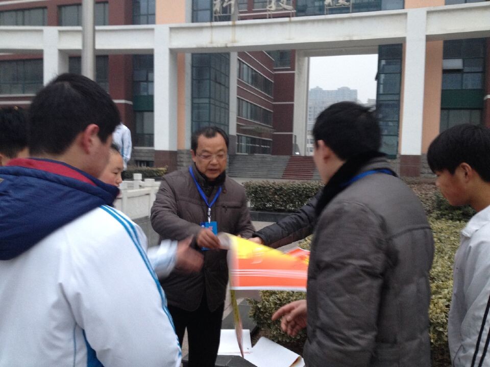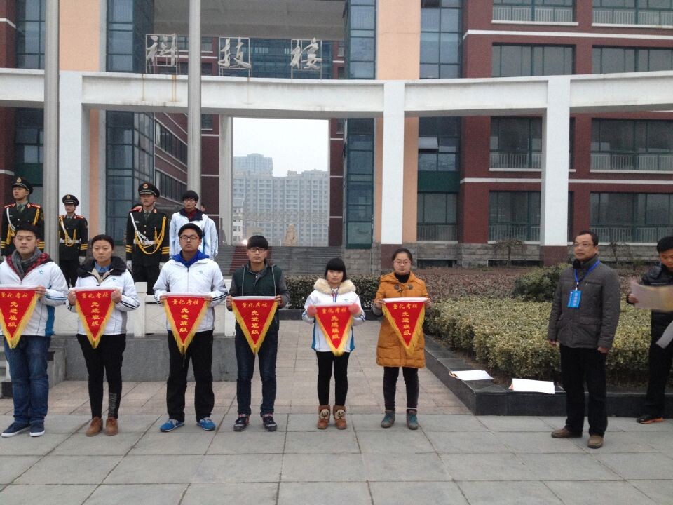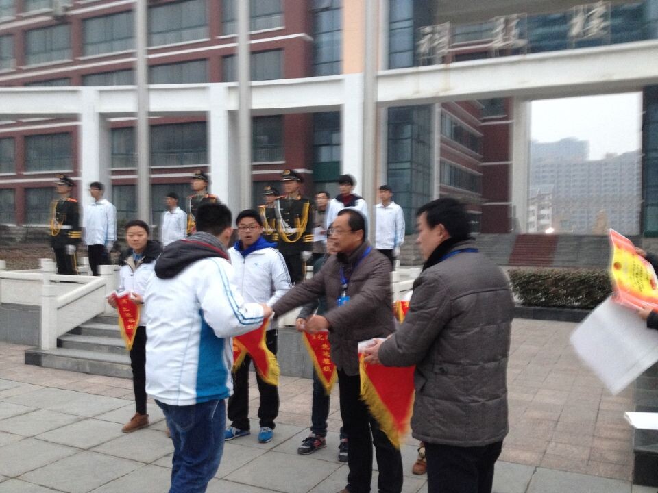 2015年1月5日,升旗仪式上,校长纪迎春为荣获2014年11月量化考核优秀集体(高一15、高一27、高二13、高二25、高三16、高三27)颁奖和迎新春跑操比赛优秀集体(已公布)颁奖。