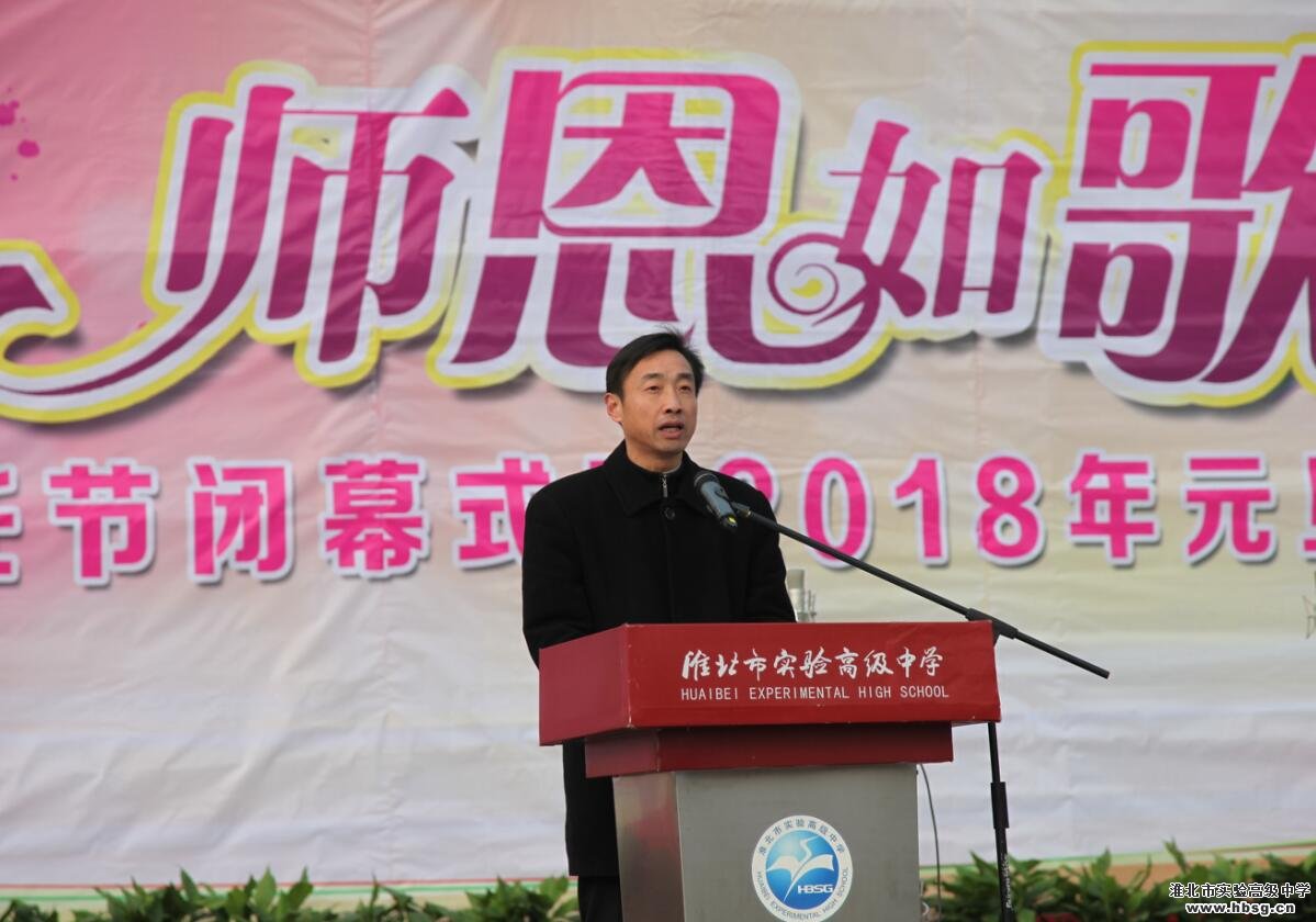 新年临近,校园里辞旧迎新的气氛日益浓厚。2017年12月28日上午,学校在升旗广场隆重地举办了“师恩如歌——首届班主任节闭幕式暨2018年元旦汇演”。演出开始前,池永平校长致新年贺词。池校长代表学校党政领导班子向全校的师生致以新年的问候和美好的祝福。池校长回顾了学校2017年各项工作取得的成绩;2018年,学校党委将全面贯彻落实党的十九大精神,团结带领全校师生,齐心协力、团结奋斗,让实验高中2018更精彩!
