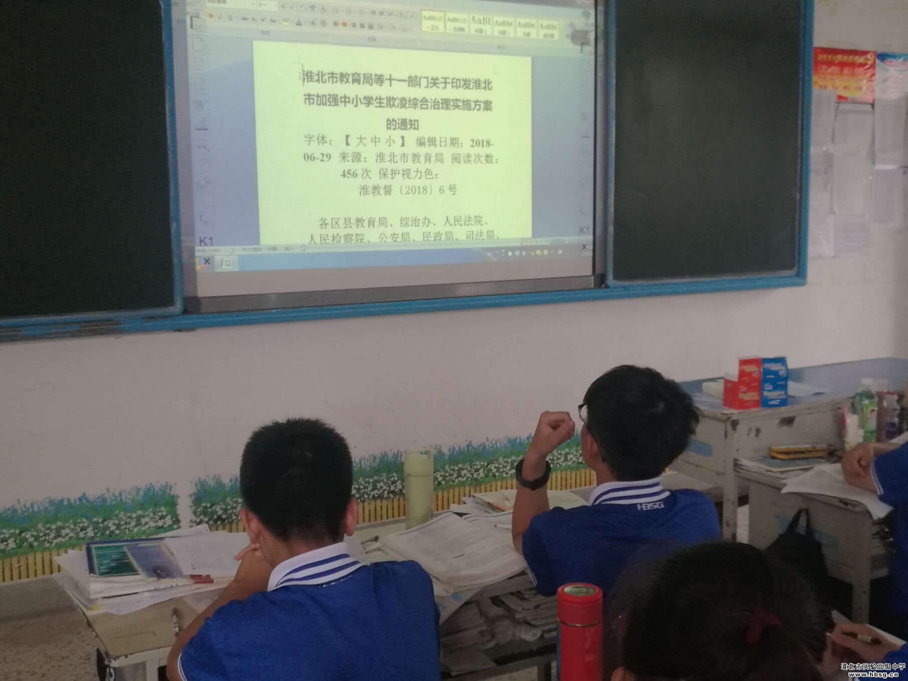为了贯彻落实《安徽省教育厅关于做好预防青少年儿童溺水工作的通知》和《淮北市教育局等十一部门关于印发淮北市加强中小学生欺凌综合治理实施方案的通知》的精神,各班级根据学校的统一部署,于7月2日下午召开了一次主题班会,向同学们认真传达了通知的要求及相关的具体措施。同学们纷纷表示将严格遵照通知的要求,从而打造实验高中和谐校园以及度过一个安全、快乐的暑假。