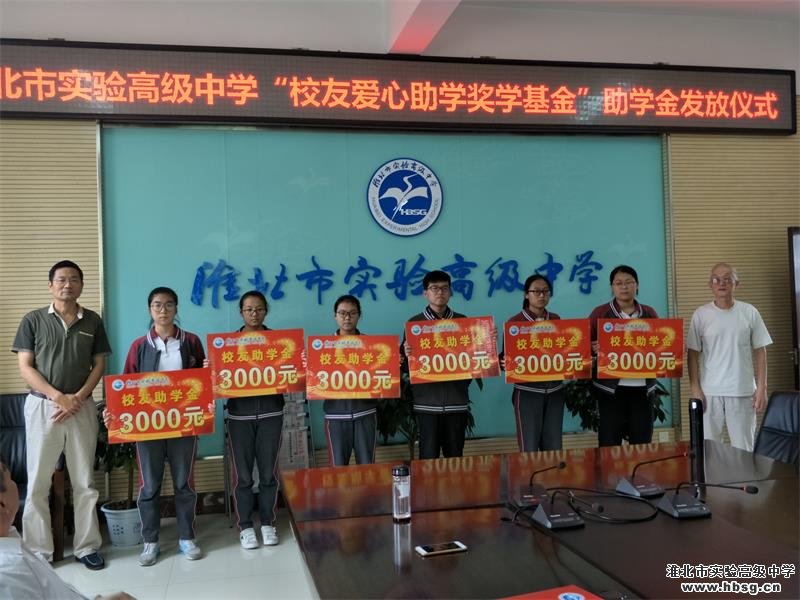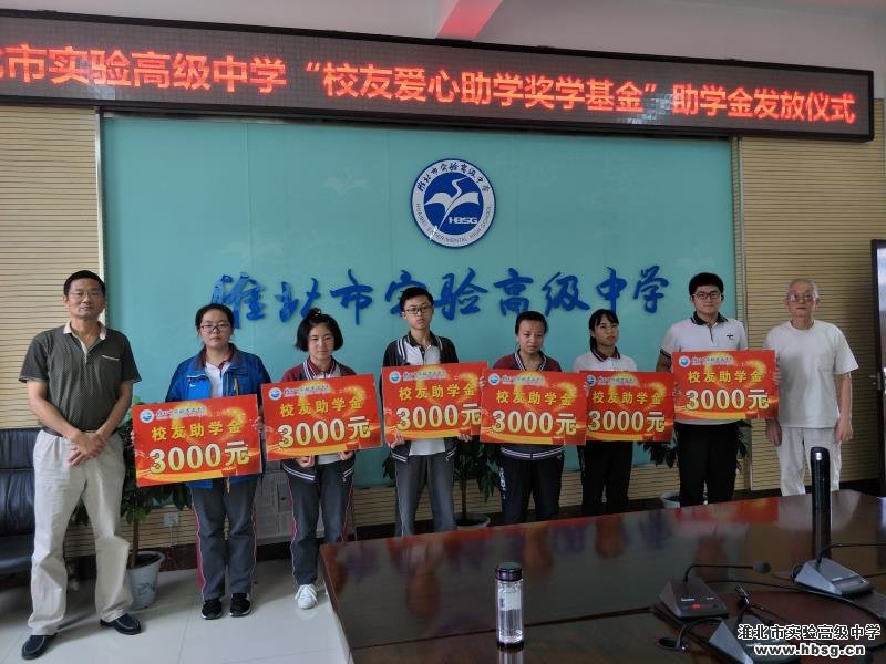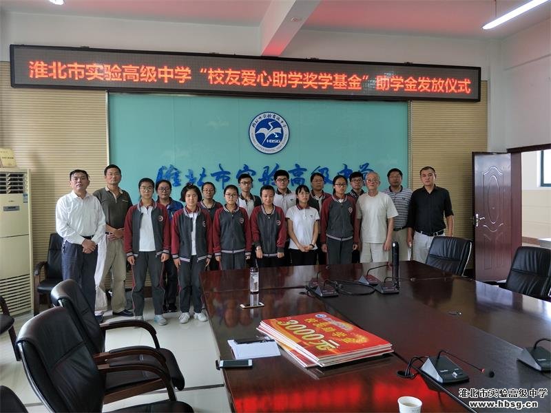 资助方代表余中秋老师(实验高中退休教师)、杨子明主任(淮北职业技术学院),实验高中副校长张成荣、学生资助中心副主任高明、2016级高三德育主任王安然、张大干,以及受资助的2016级13名同学参加活动。