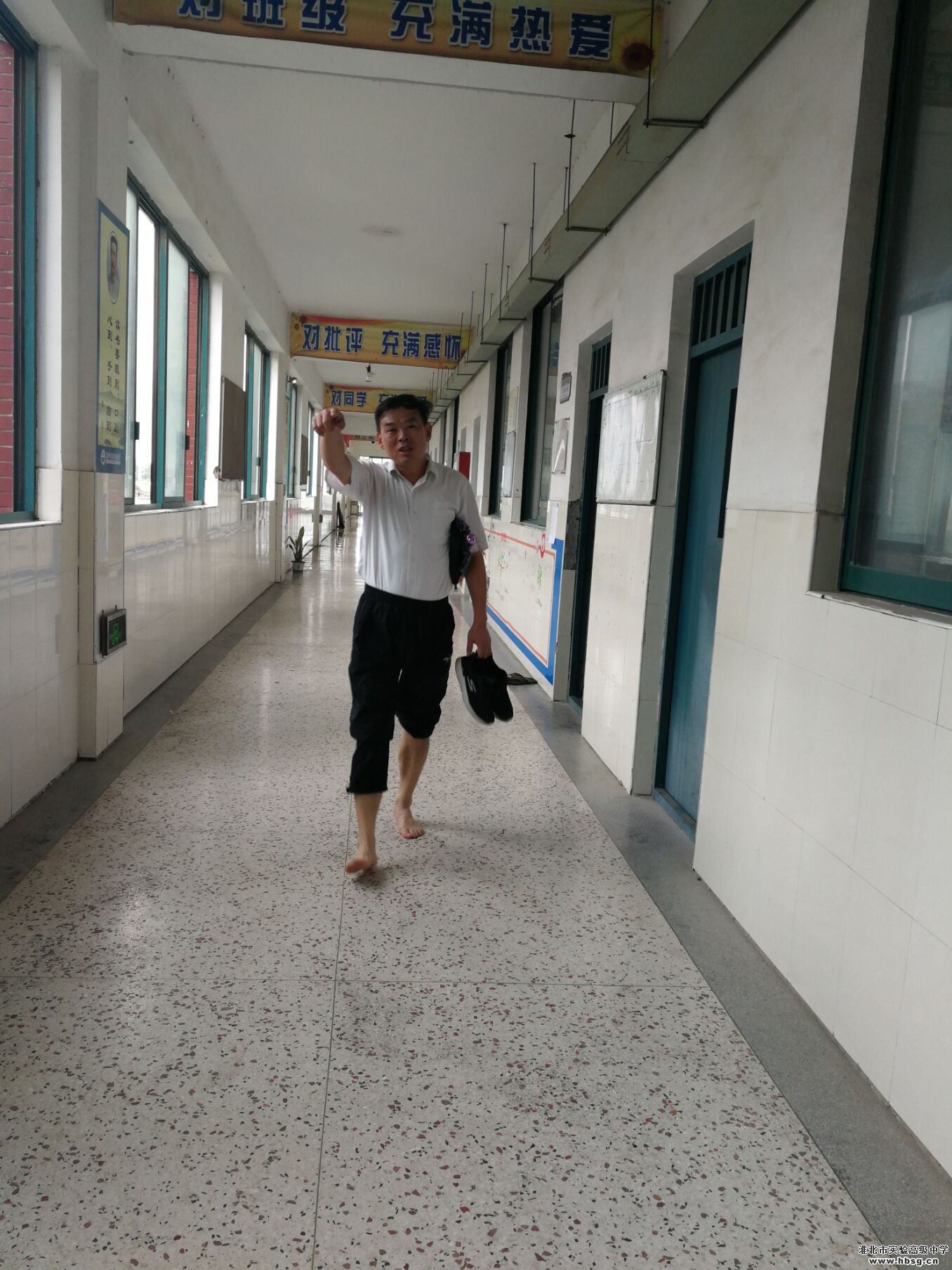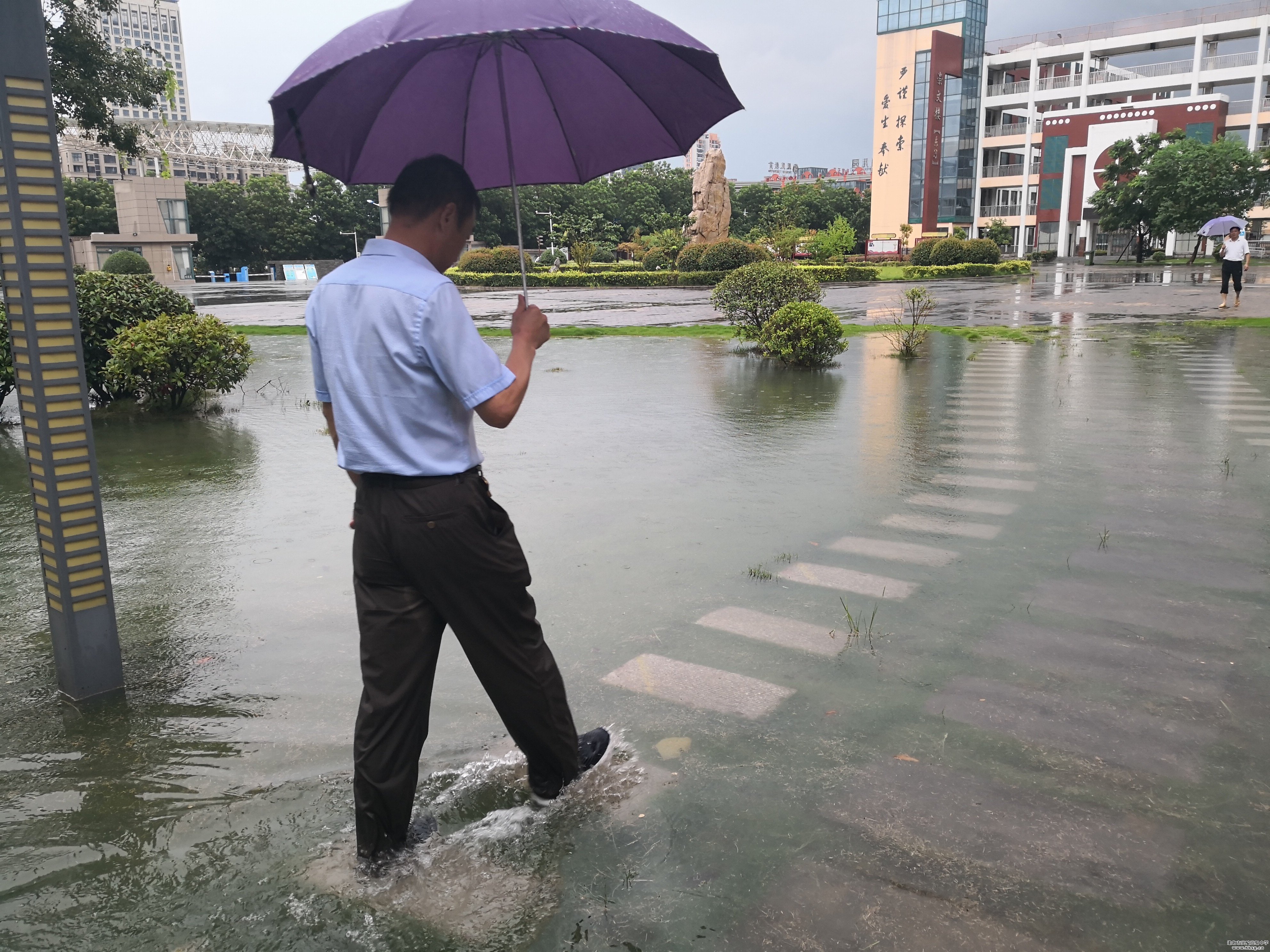 校长池永平、德育校长张成荣冒雨巡视住校生军训并关注学校水情