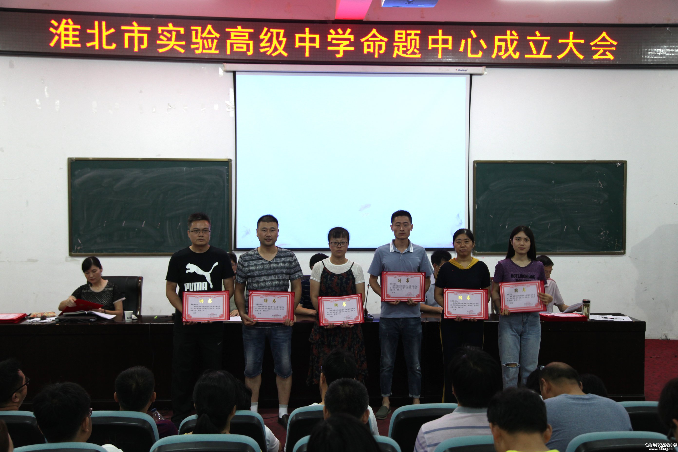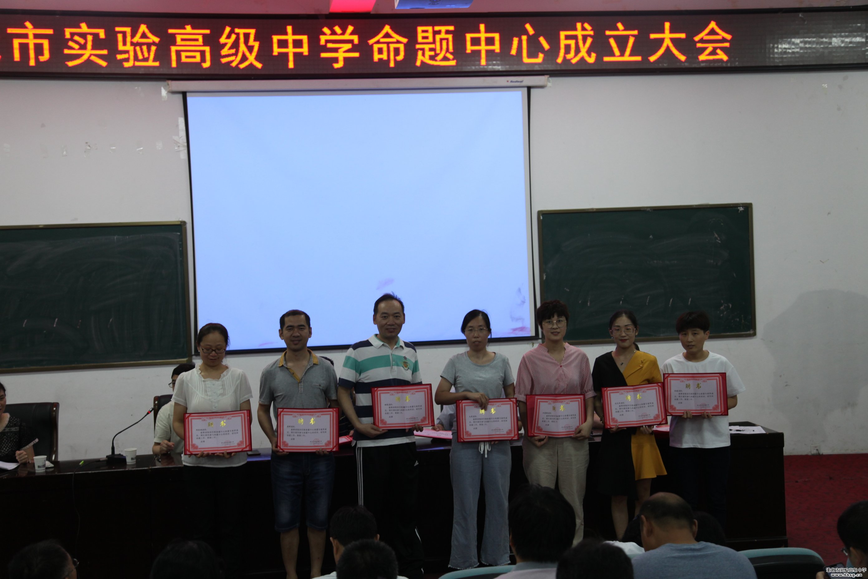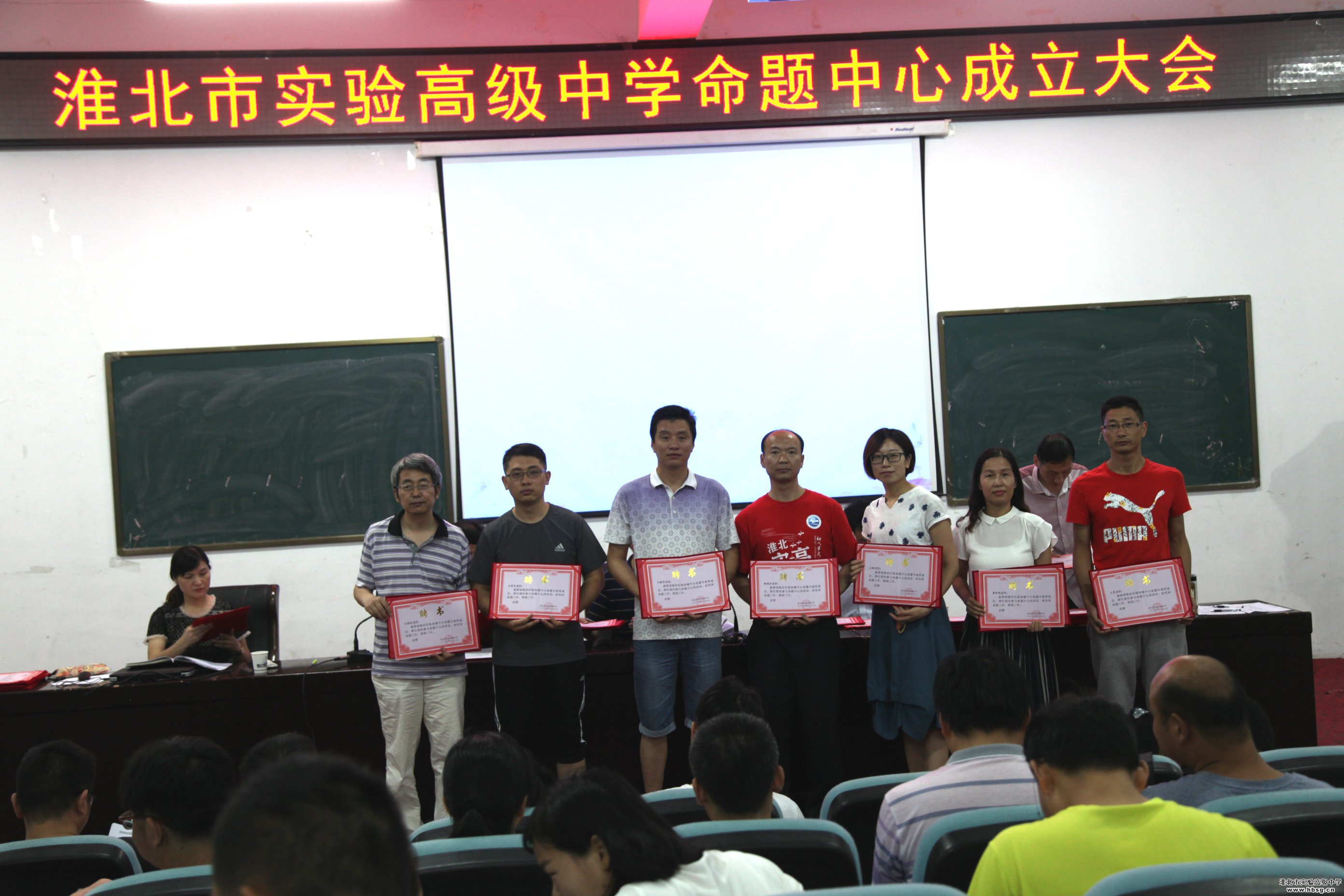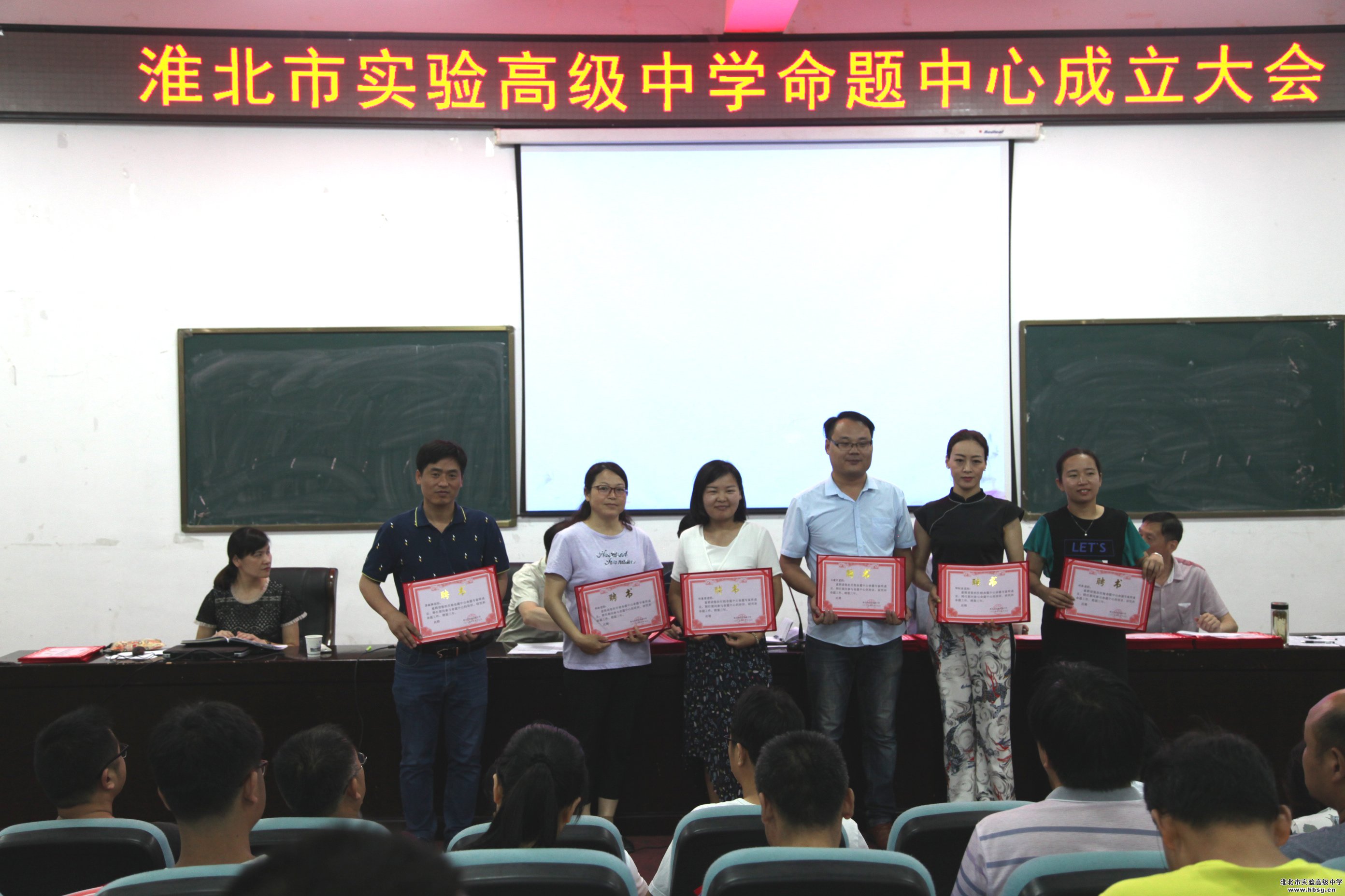 2019年6月19日上午,在会议中心一楼报告厅召开的校命题中心成立暨培训会中,校长、校党委书记池永平,副校长方明洋,教科处主任徐英柏,副主任刘芳,金太阳教育测评中心主任刘东明为我校命题中心首批专家库成员颁发聘书。命题中心首批专家库成员由我校中青年骨干教师组成,采取个人自荐,教研组推荐、教科处审定,报学校审批的方式产生,共计72名。聘期三年。、