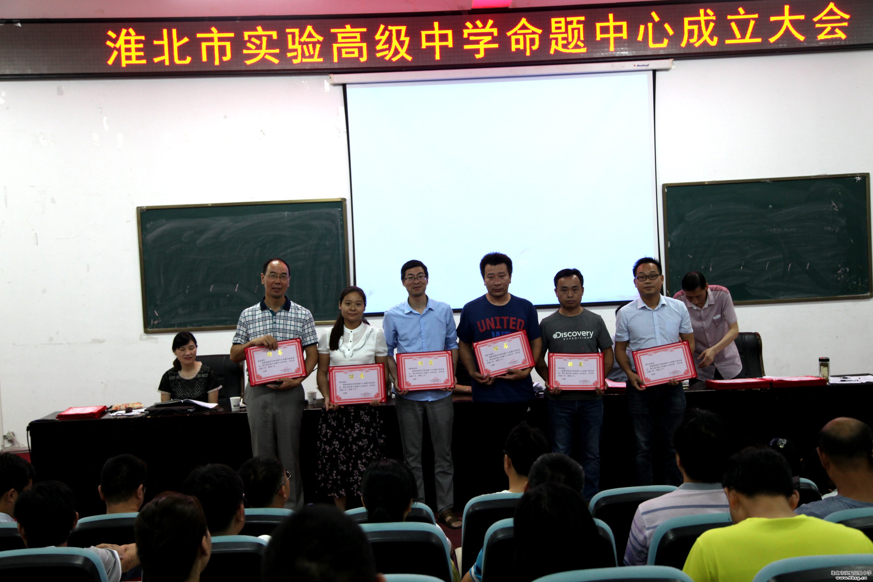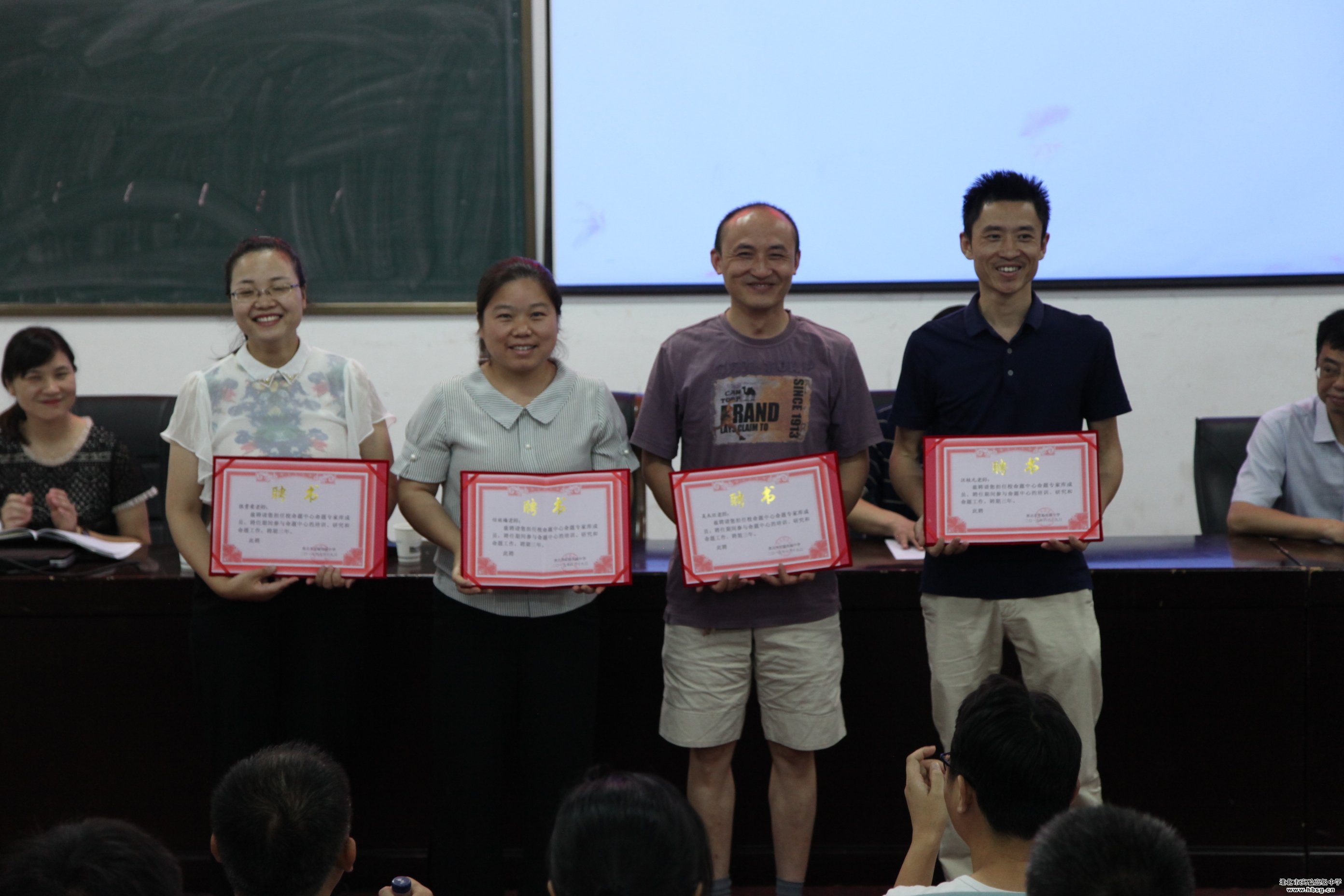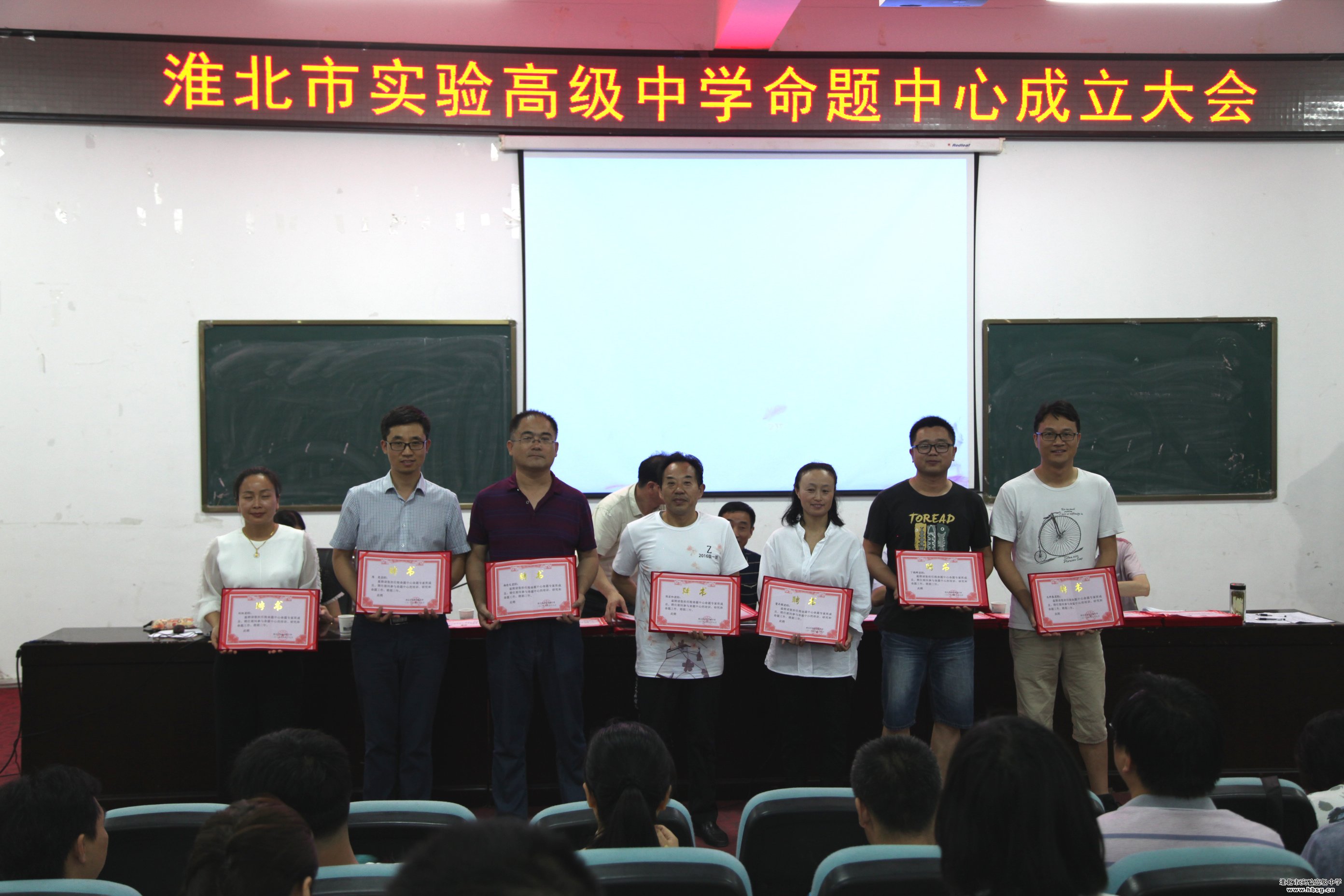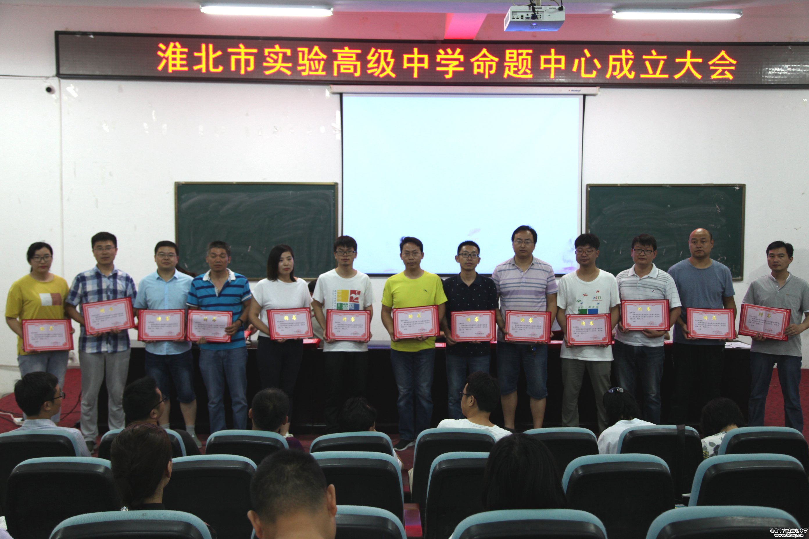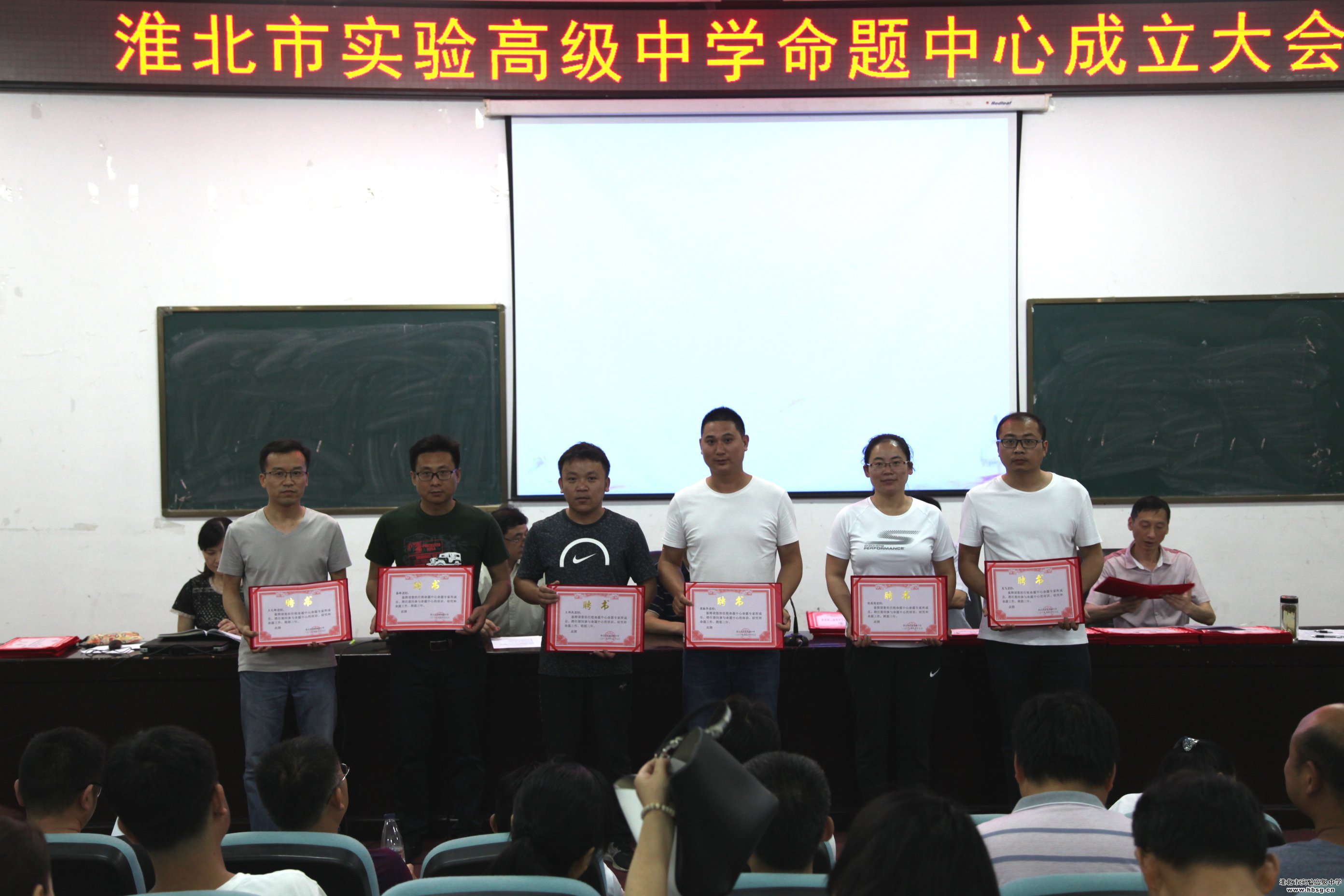 2019年6月19日上午,在会议中心一楼报告厅召开的校命题中心成立暨培训会中,校长、校党委书记池永平,副校长方明洋,教科处主任徐英柏,副主任刘芳,金太阳教育测评中心主任刘东明为我校命题中心首批专家库成员颁发聘书。命题中心首批专家库成员由我校中青年骨干教师组成,采取个人自荐,教研组推荐、教科处审定,报学校审批的方式产生,共计72名。聘期三年。、