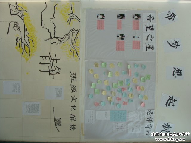 各班同学在班主任的指导下,集思广益,精心构思,认真实施,打造出了具有各具特色的班级文化。每个班级都有自己的亮点和创意,有的将小组文化积极展示出来,有的将同学照片贴在班级文化墙上,有的将大学校徽画在醒目位置,有的制作了好人好事栏……无不渗透着师生们的智慧和创造力,体现着同学们的艺术才华,诠释着班级成员对未来的美好期望。