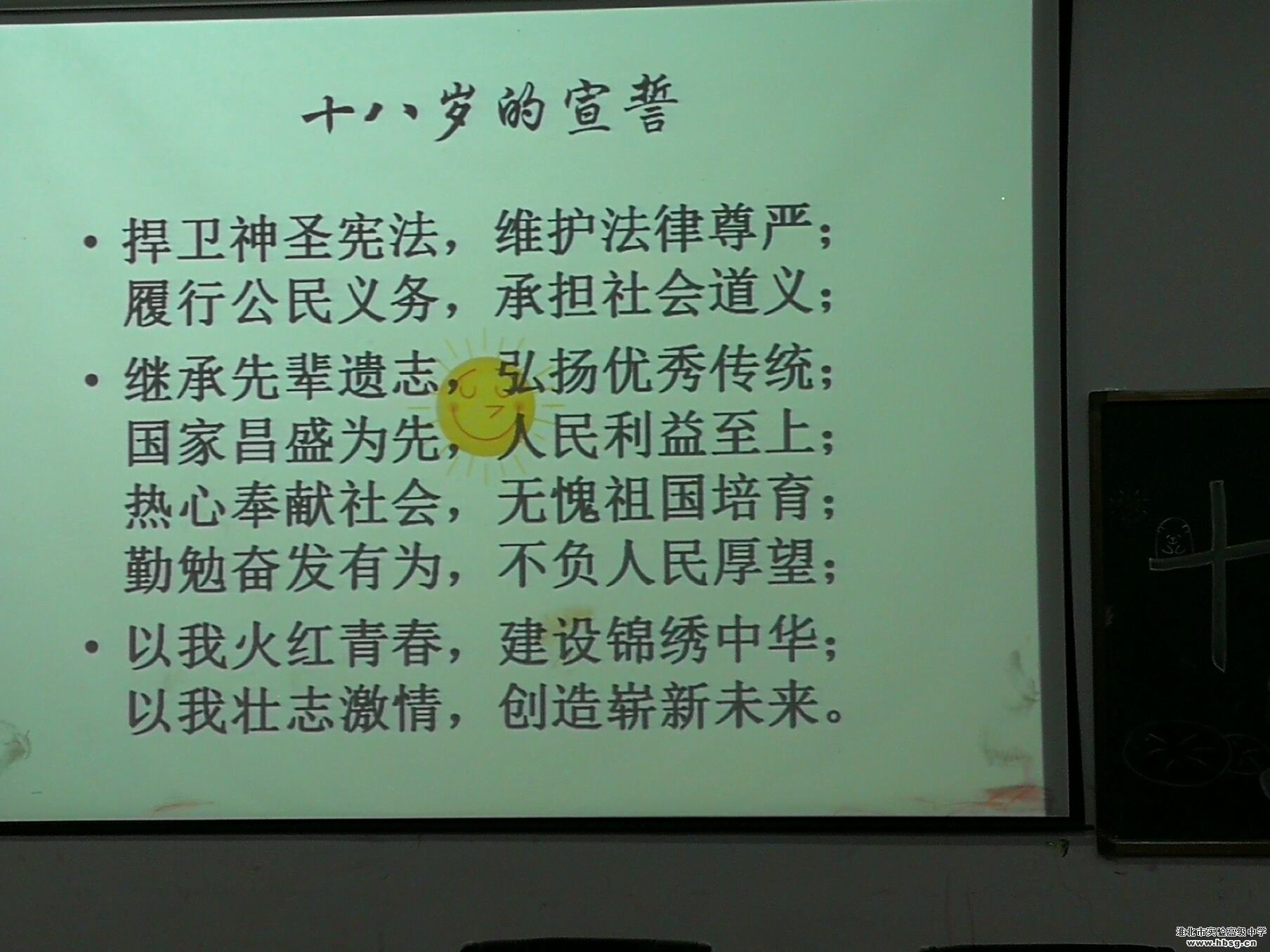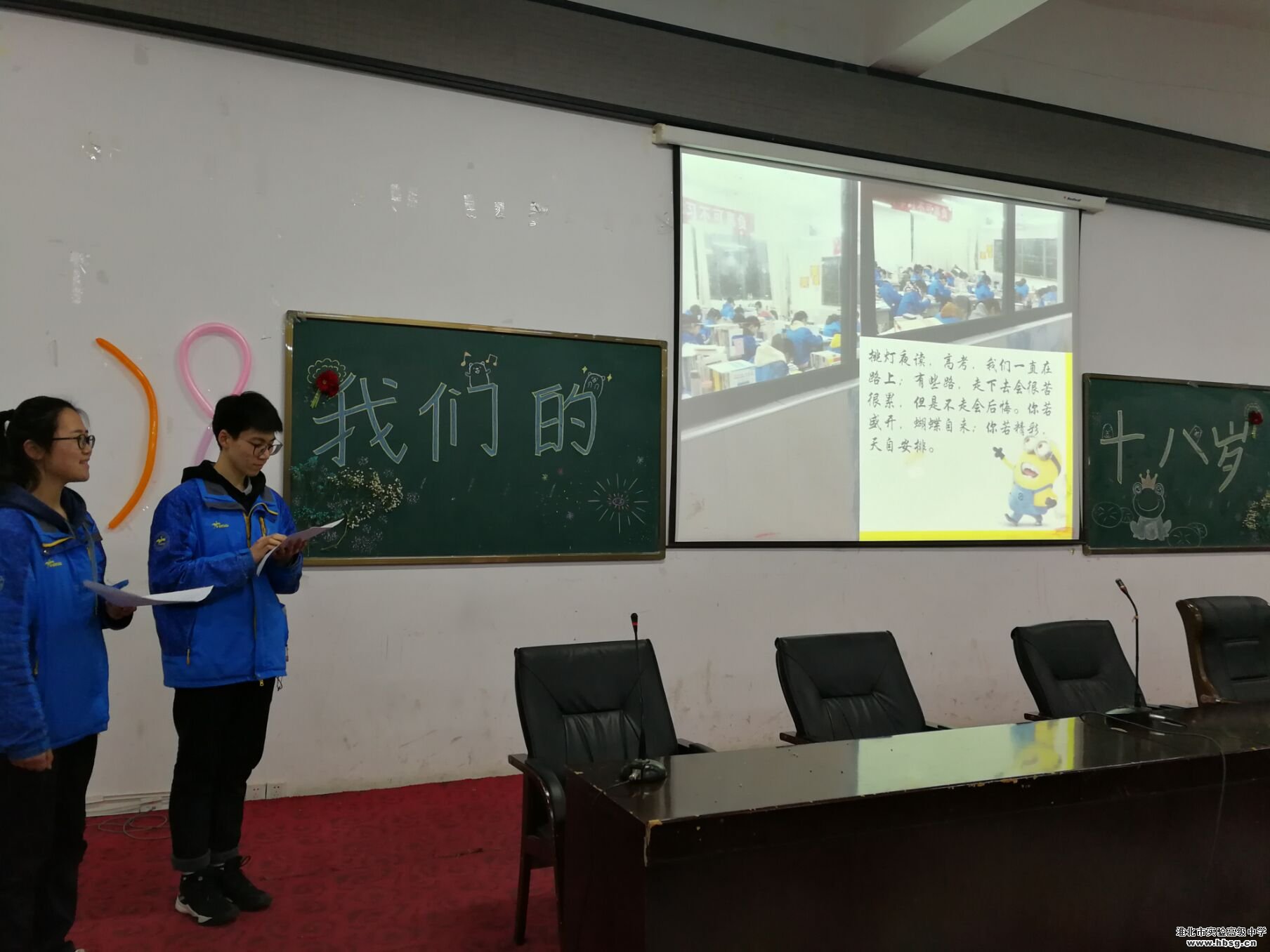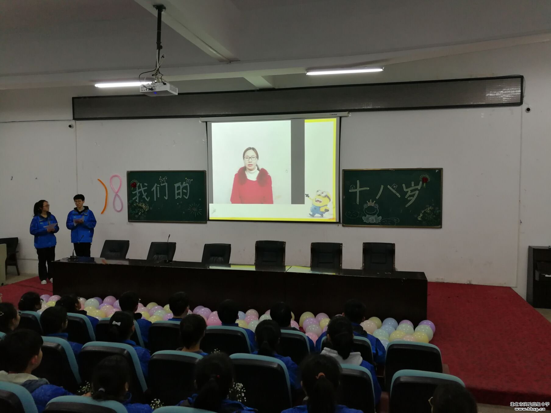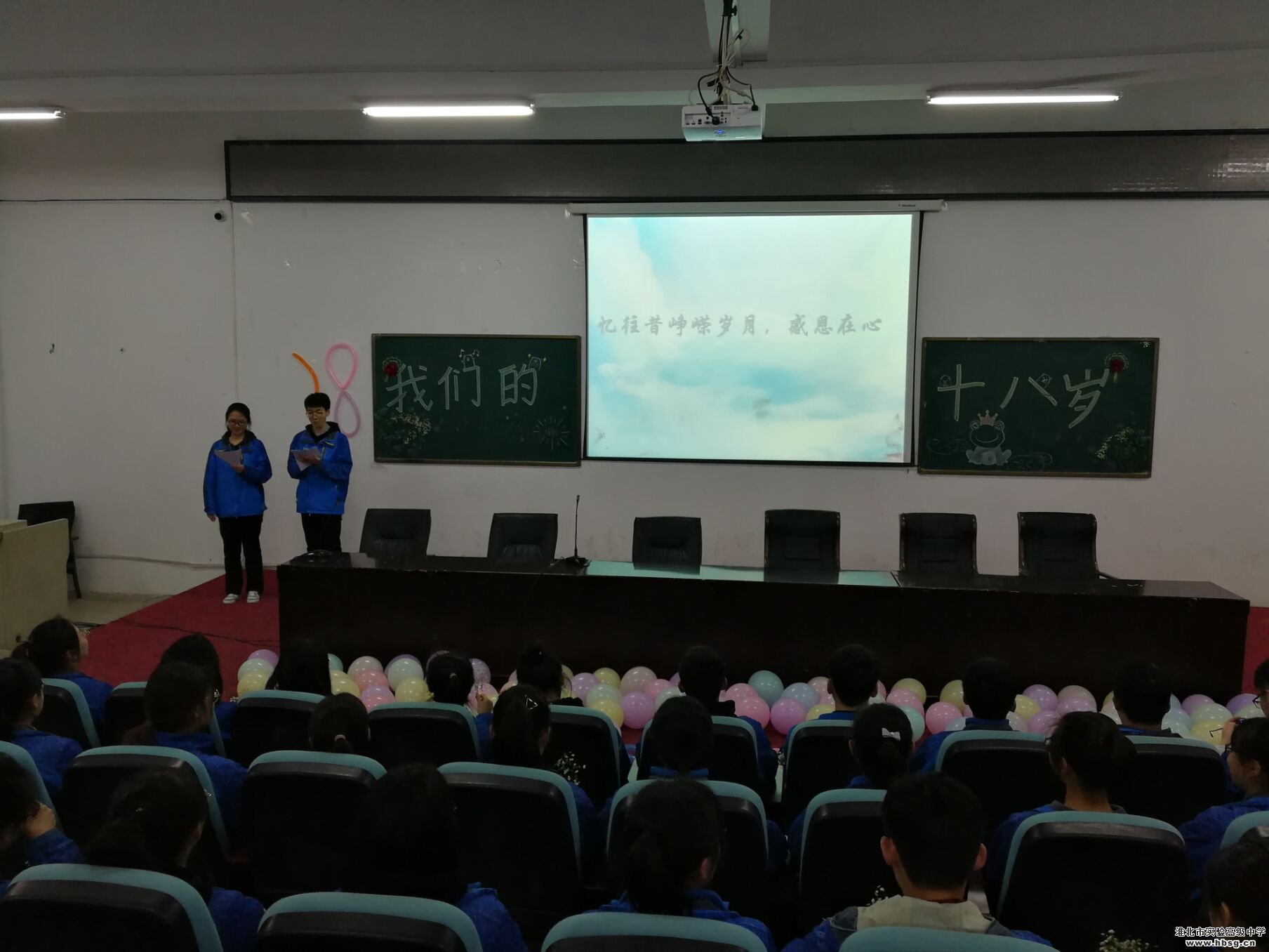 为抓住中学生从未成年向成年转变的关键时期,对广大中学生进行理想信念教育、思想道德教育、国家观念教育、优秀传统文化教育,引导和帮助广大中学生树立正确的世界观、人生观、价值观,增强公民意识、宪法和法律意识、责任意识、感恩意识,努力成为担当民族复兴大任的时代新人,为决胜全面建成小康社会、全面建设社会主义现代化国家、实现中华民族伟大复兴的中国梦而不懈奋斗。淮北市实验高级中学团委抓住贯彻落实十九大精神的时代契机,结合本校学生实际,积极开展2019年十八岁成人主题教育活动。在系列活动中,2019届高三(23)班的主题班会格外引人注目。现场的彩色气球、卡通数字“18”、学生主持人……精心的布置、用心的准备,呈现出一场精彩的青春盛会。学生们在热烈的气氛中,感受着成长与成人,明白了青春的意义和青年的担当,同时也诉说着感恩。
