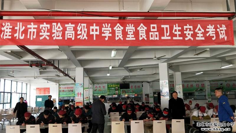 2018年3月16日上午8;30,淮北市实验高级中学总务处组织全校食堂工作人员,在食堂餐厅参加食品安全知识考试,参加考试的共有61人,食堂管理人员同考,王永、丁跃华监考。考试中,关明校长和黄炜主任对考试情况进行了现场检查。